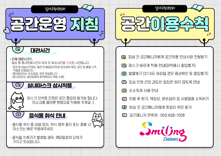 주민등록상 주소지 또는 달서구 소재 대학(원) 재학생, 달서구 소재 기업(기관), 재직자 또는 달서구 소재(예비 창업가) 신청자는 대관 규정을 확인 후 신청해야 하며 구체적으로 확인하지 않아 발생한 모든 사항은 대관 신청자에게 책임이 있습니다.